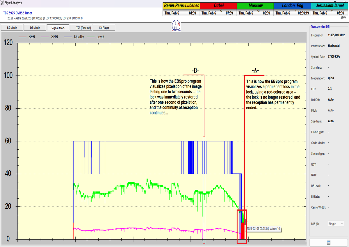 ►-B- : Takto program EBSpro vizualizuje samotnú pixeláciu obrazu v trvaní jedna až dve sekundy-Lock sa po sekundovej pixelácii okamžite obnovil a kontinuita príjmu
