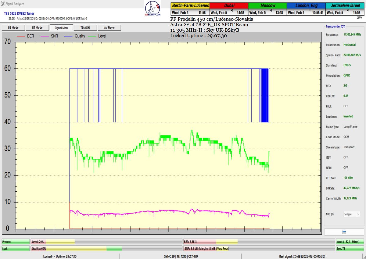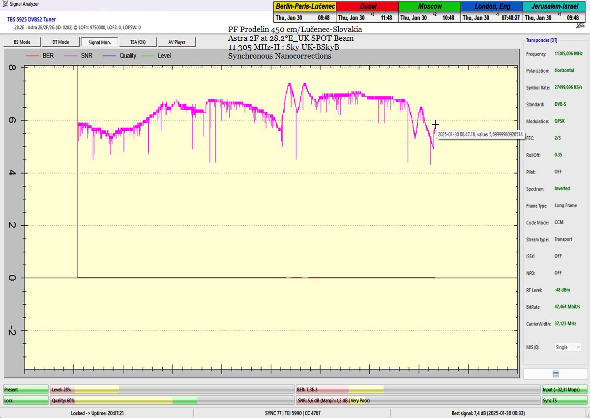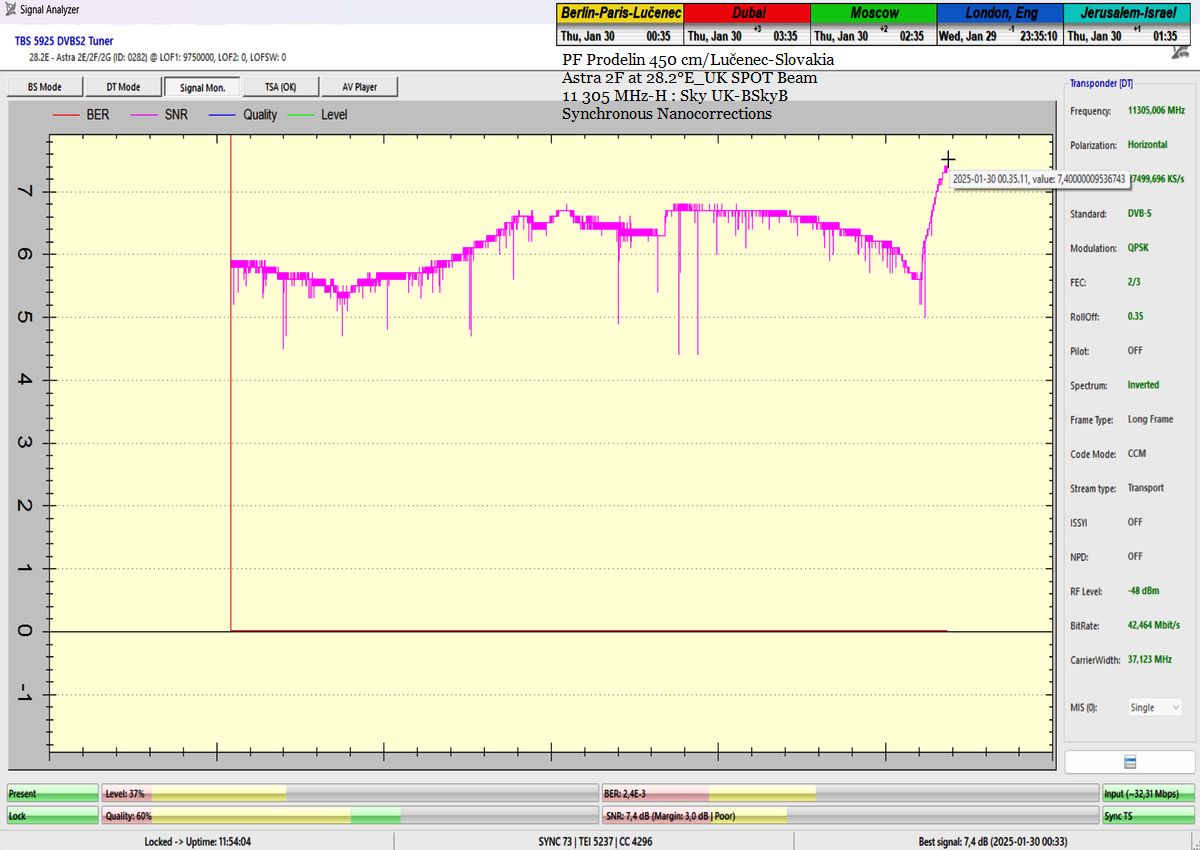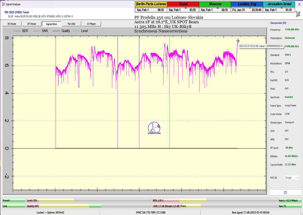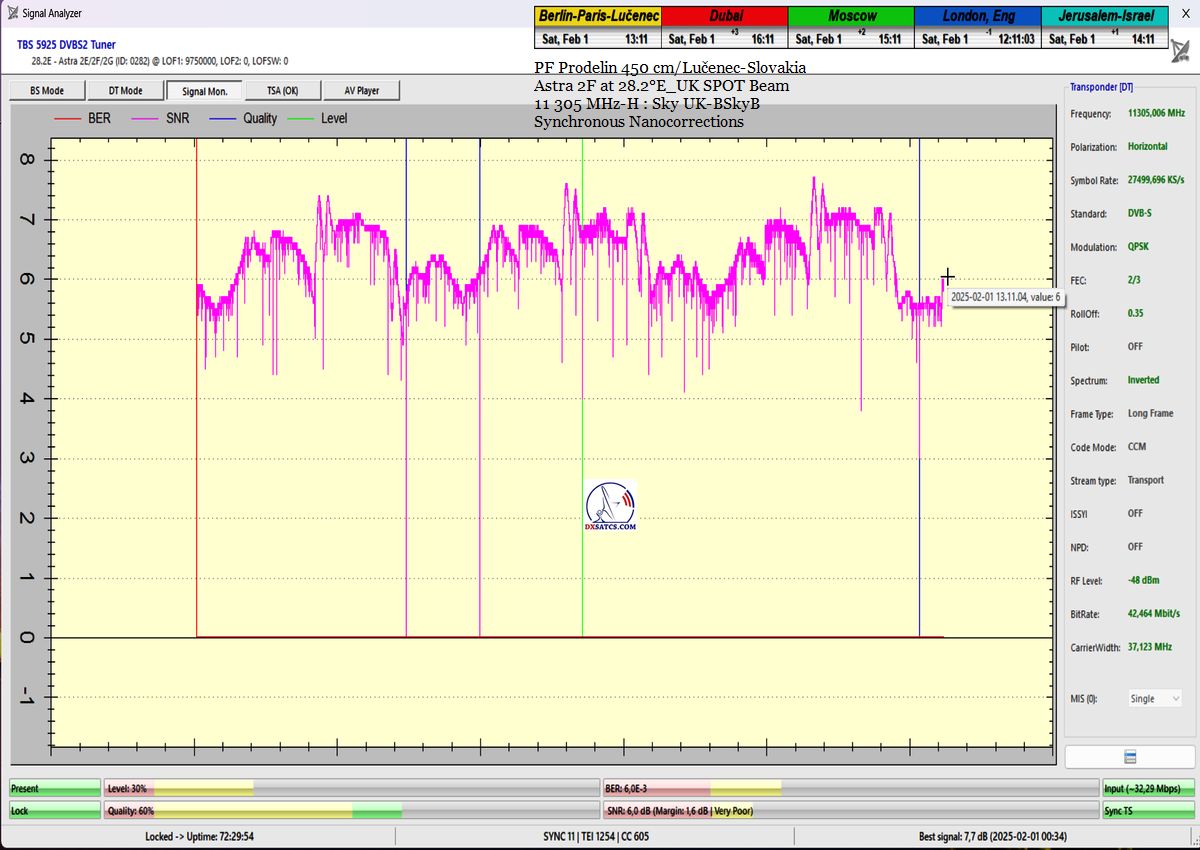 11.2.2025_ASTRA 2F-28,2°E_UK Spot Beam : Successful application of my technological invention "Synchronous Nano-Corrections" on the 11305-H carrier of Sky/BSkyB,with reception stability verified through signal monitoring over a total duration of 100+hours