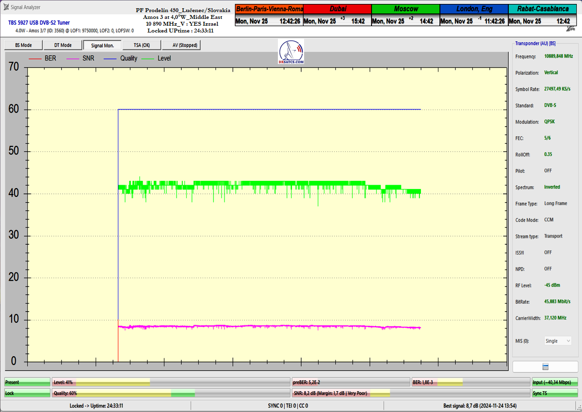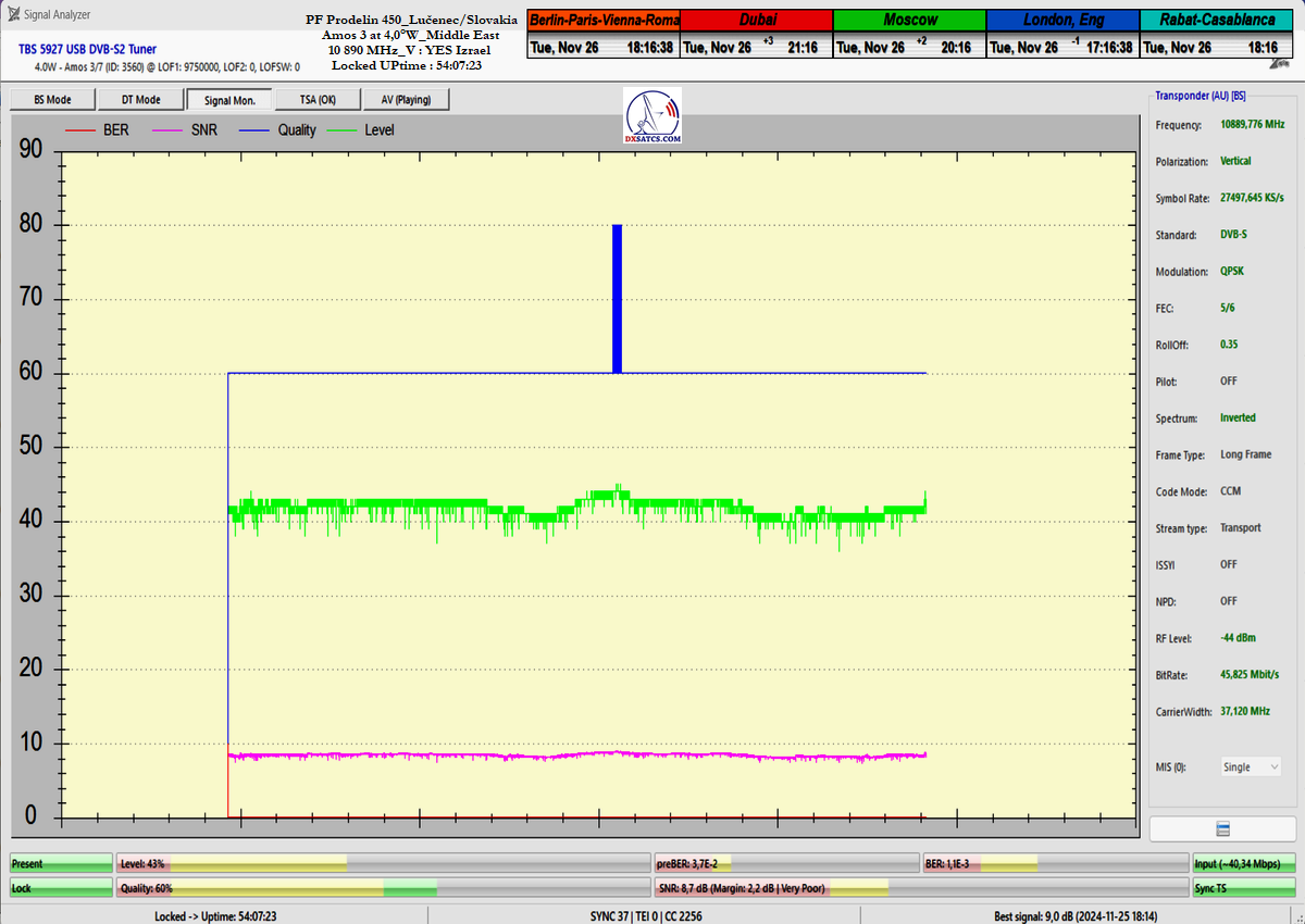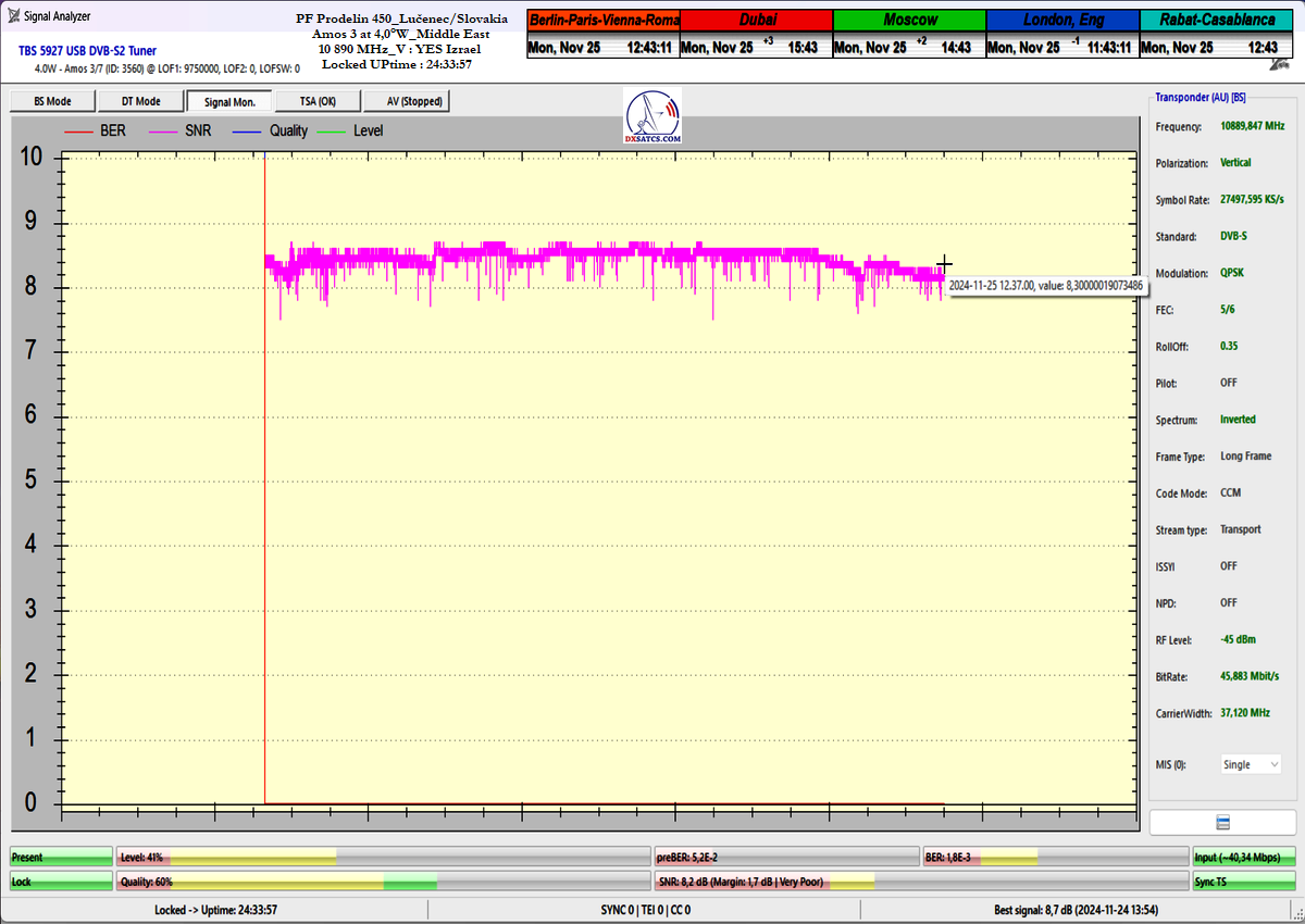 30.11.2024 : CBER=3.5E-3/MER=9,0 dB _ A typical peak quality was achieved using the calibrated Televes H60 analyzer, whose results