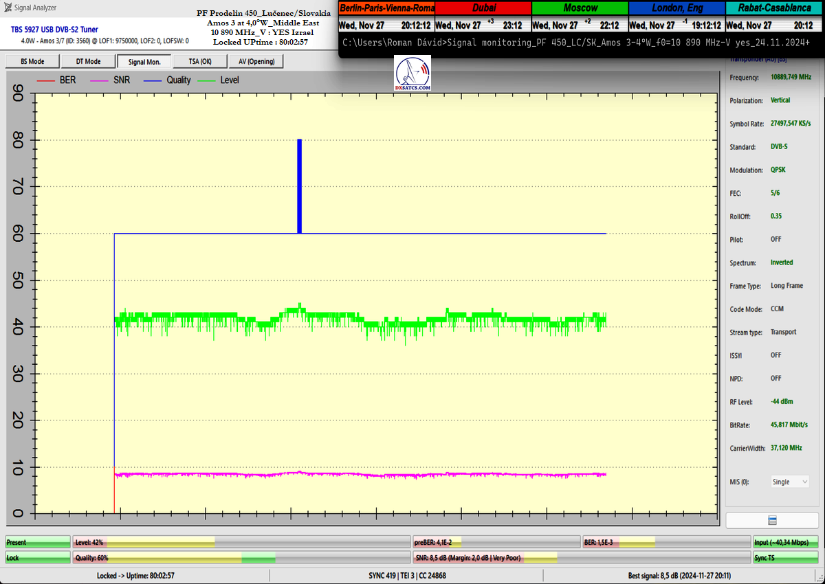 ►10 890 MHz_V : YES _ stabilita príjmu na 100% s minimálnym rozkmitom oscilácie úrovní výkonu signálu , konkrétne len 8 dBm za 80 hodín