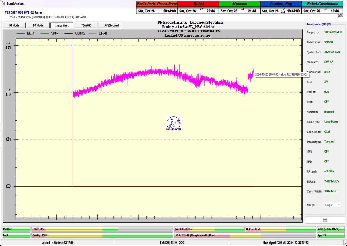 ►►Badr 7 at 26.0°E-Northwest Africa : Continuous signal monitoring / Nepretržitý signálny monitoring