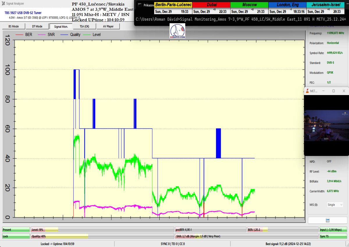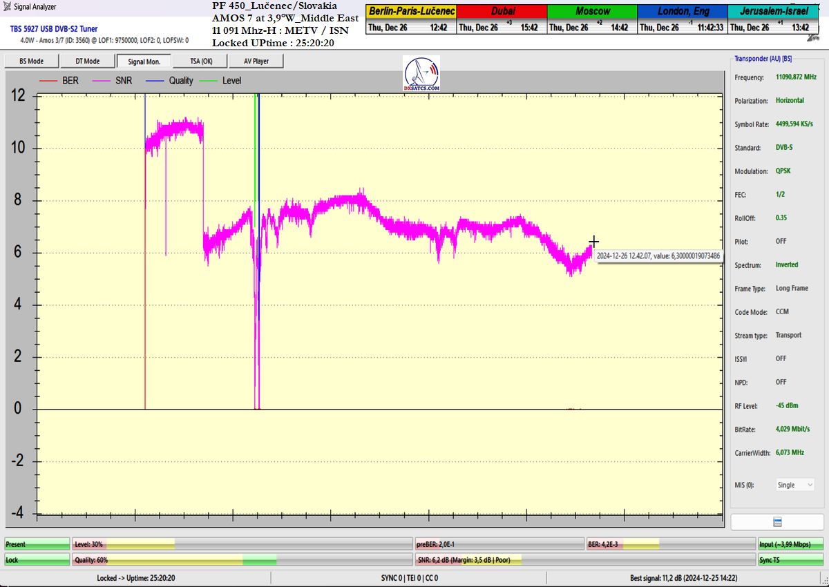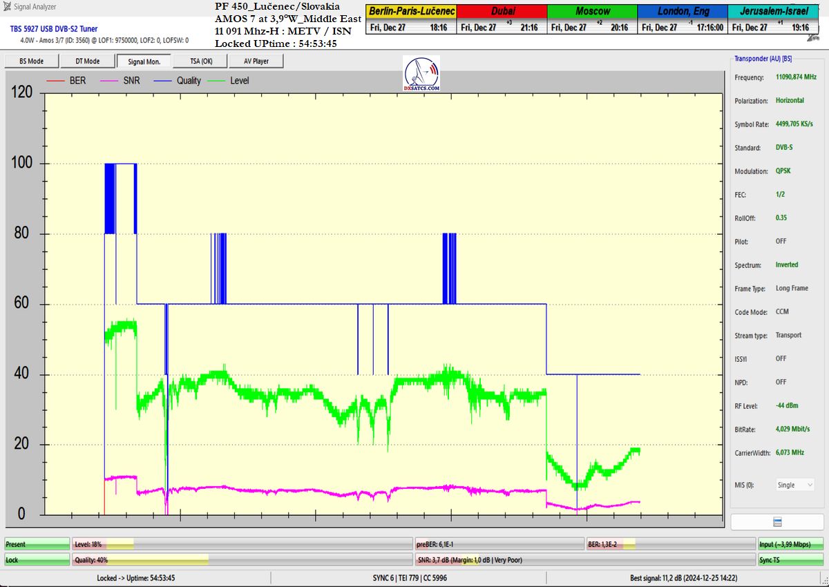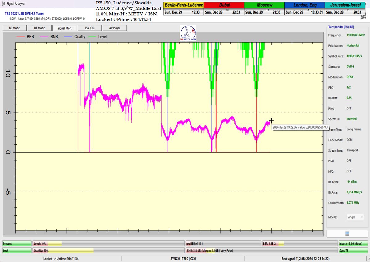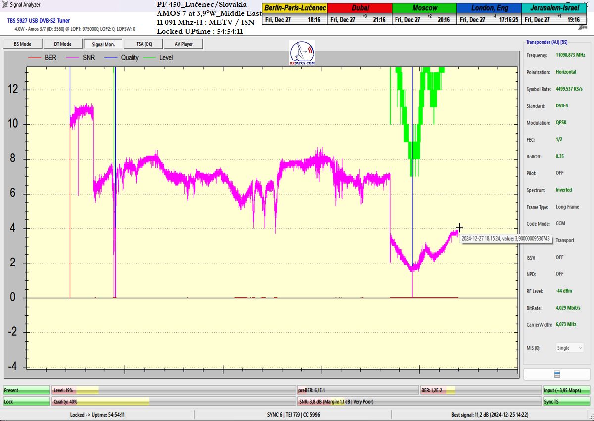 som nemohol ani len začať. Po niekoľkých hodinách výskumov som musel pochopiť a zároveň akceptovať že táto chyba spojená s permanentným rastom okamžitej chybovosti ChBER ja na mojej strane a nejako nesúvisí s ultra nízkou hladinou v intenzite výkonu vlnenia v H polarizácii na f=11 091 MHz v diagrame Middle East družice Amos 7 na 3,9°W. K tomuto presvedčeniu som dospel po hĺbkovej analýze,pretože som nechápal ako je možné že stabilný príjem nebol možný ani pri výške signálnej rezervy okolo 3 dB.Potom čo som v doobedňajších hodinách dňa 25.12.2024 našiel príčinu,zdroj rušenia a hlavne harmonickú zložku signálu,ktorá sa superponovala vo frekvenčnom spektre analyzovanej nosnej sa okamžite hladina signálneho poľa vo vlnovode stabilizovala a od tohto momentu sa datuje že aj pri ultra nízkej výške kvality okolo SNR=1,8-2,5 dB dosahujem plne stabilný príjem bez akýchkoľvek výpadkov v Locku (alebo Pixelácie),čo je v kontexte použitého programu EBSPro už záporná výška signálnej rezervy z dôvodu aplikovanej konfigurácie modulačných parametrov DVB-S/QPSK/FEC=1/2 pri výške minimálneho odstupu C/N pre Lock vo výške len CN=2,7 dB.Keby sa mi nepodarilo identifikovať a odstrániť príčiny spojené s rušením analyzovanej nosnej vo frekvenčnom spektre,ktoré boli jednoznačne na mojej strane a nijako nesúvisely so signálnymi podmienkami spojenými s príjmom v zóne "Out of footprit",alebo Mimo stopy, potom by som nemal dnes čo publikovať a chybne by som kategorizoval tento príjem označením "Čakanie na náhodu,alebo špičku výkonu-Sat DX".Do desiatich minút potom ako som vymenil chybný komponent v signálnom reťazci a hladina signálneho poľa sa stabilizovala a prestala cyklicky a vo vysokej amplitúde oscilovať a potom čo som na anténnom systéme,pomocou digitálneho uhlomera nastavil hodnotu EL=29,69°, signálna kvalita skokovo dosiahla priam giganticky vysokej úrovne okolo SNR=10-11,2 dB,ktorú som doteraz nikdy nezaznamenal,čo je reálna výška rezervy okolo 7-8 dB,ktorá umožňuje nestabilnú formu Locku už na minimálnych priemeroch reflektorov od d=180 do 220 cm.