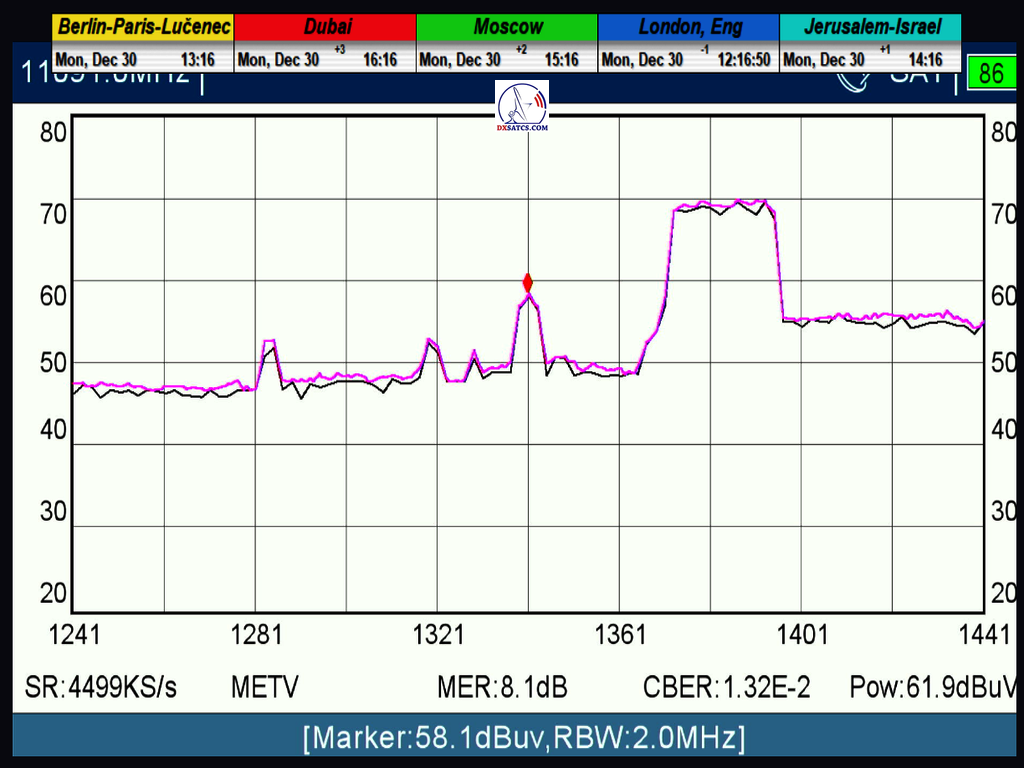 ►EN_In order to begin and carry out signal monitoring, I had to identify and eliminate the source of interference in the frequency spectrum, which was causing periodic lock failures of the carrier signal at any signal reserve level, typically oscillating from 1 to 3+ dB. To put it simply, no matter how high the current signal quality was (typically in the morning hours from 1.8 to 5+ dB), pixelation was always present in the image, and there were periodic lock failures of the carrier signal. This meant that I couldn't even begin signal monitoring. After several hours of research, I had to understand and accept that this error, associated with the permanent increase in instantaneous ChBER errors, was on my side and was not related to the ultra-low level of wave power intensity in H polarization at f=11,091 MHz in the Middle East region of the Amos 7 satellite at 3.9°W. I reached this conclusion after a thorough analysis, as I couldn't understand how it was possible that a stable signal could not be achieved even with a signal reserve of around 3 dB. Then, on the morning of December 25, 2024, after identifying the cause of interference and, most importantly, the harmonic component of the signal superimposed in the frequency spectrum of the analyzed carrier, the signal field strength in the waveguide immediately stabilized. From this moment on, even at ultra-low quality levels around SNR=1.8-2.5 dB, I was able to achieve fully stable reception without any lock failures (or pixelation), which, in the context of the EBSPro program used, is already a negative signal reserve due to the applied DVB-S/QPSK/FEC=1/2