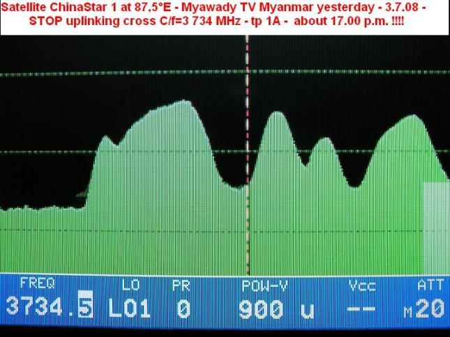 DXSATCS-Roman Dávid PRESENTS EUROPEAN ORBIT-NEWS PREMIERE FROM SATELLITE ChinaStar 1 at 87,5°E - C - : MYAWADY TV Myanmar STOP uplinking cross C/f=3 734 H - tp 1A - yesterday about 17.00 p.m - check new PDF.............WEB DXSATCS-Roman Dávid Vám EXKLUZÍVNE NA ZÁKLADE VLASTNÝCH MERANÍ V EURÓPSKEJ PREMIERE PREZENTUJE NOVINKU z družice ChinaStar 1 na 87,5°E : MYAWADY TV Myanmar včera o 17.00 hod seč. prerušil uplink na družicu cez kmitočet 3 734 MHz -H-
