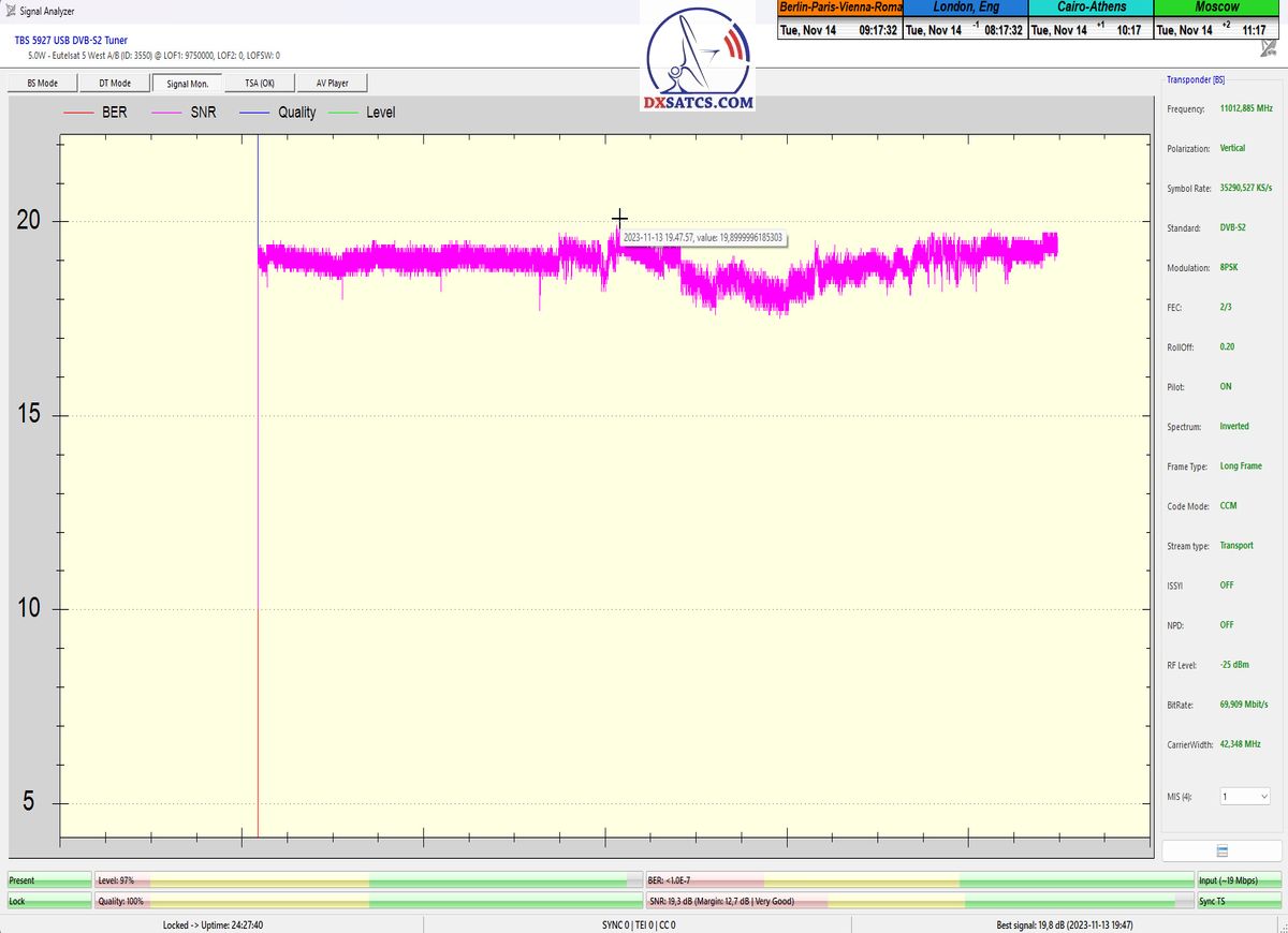 Eutelsat 5 West B at 5.0°W-Transalpine-DVB-S2/Multistream technology-reception : The proving is visualized in continuous signal monitoring over a duration of 8x24 hours
