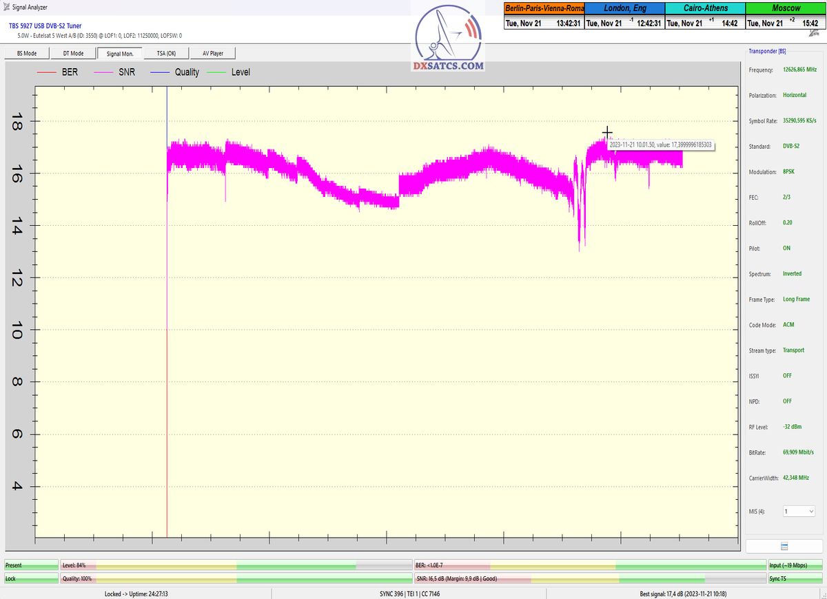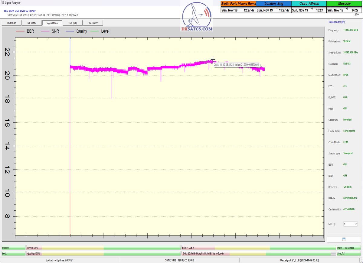 ►►Eutelsat 5 West B at 5.0°W-Transalpine-Multistream : Proving in the monitoring unit t=24 hours