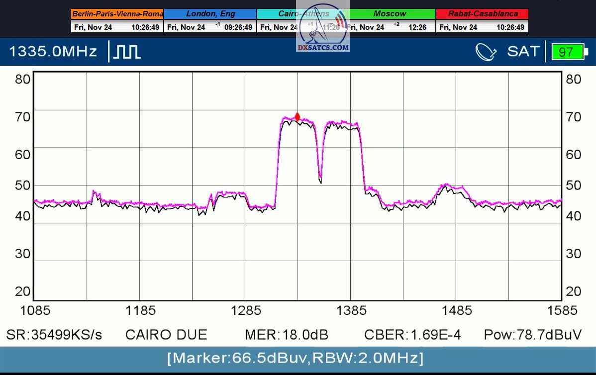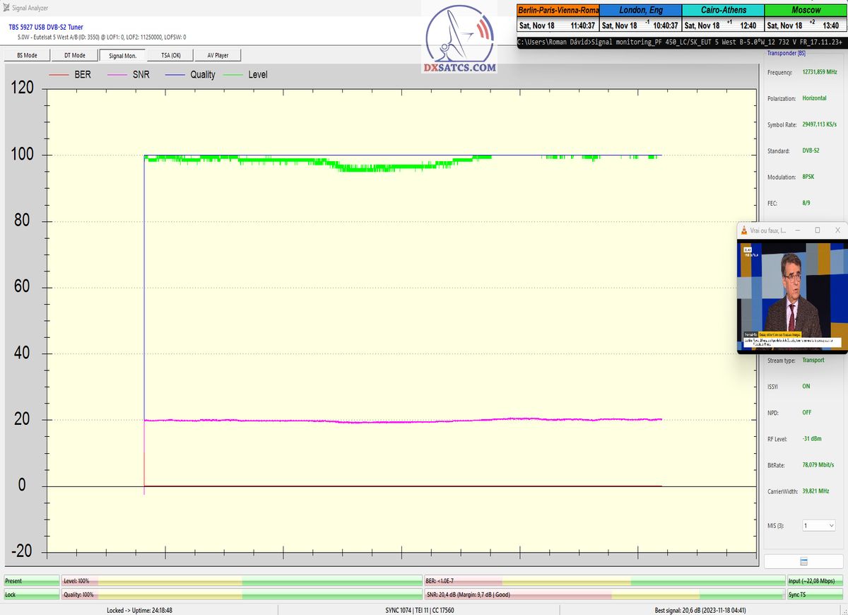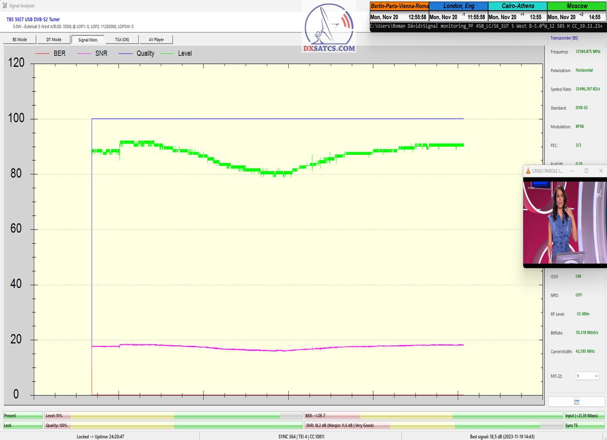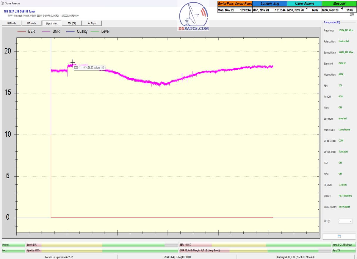 29.11.2023 :  Based on the example of proving through signal monitoring of Rai and Canal+ packets broadcast in the DVB-S2/Multistream technological standard from the Eutelsat 5 West B satellite at 5.0°W, today I can demonstrate to you that I have effectively and, above all, stably transformed the relatively high intensity of the emitted EIRP power into the resulting quality which I quantify by the signal-to-noise ratio SNR=20>21+ dB_with the used configuration of modulation parameters of the signal path DVB-S2/8PSK/FEC=2/3.Today, I will demonstrate the effectiveness with which I have managed to minimize the mutual spectral penetration or interference of the waves from the V to the H quadrant and vice versa and how it relates to the resulting reception quality. I will perform a spectrum analysis with a frequency span of only 200 kHz, visualizing the presence of two frequencies with TT&C signals etc.