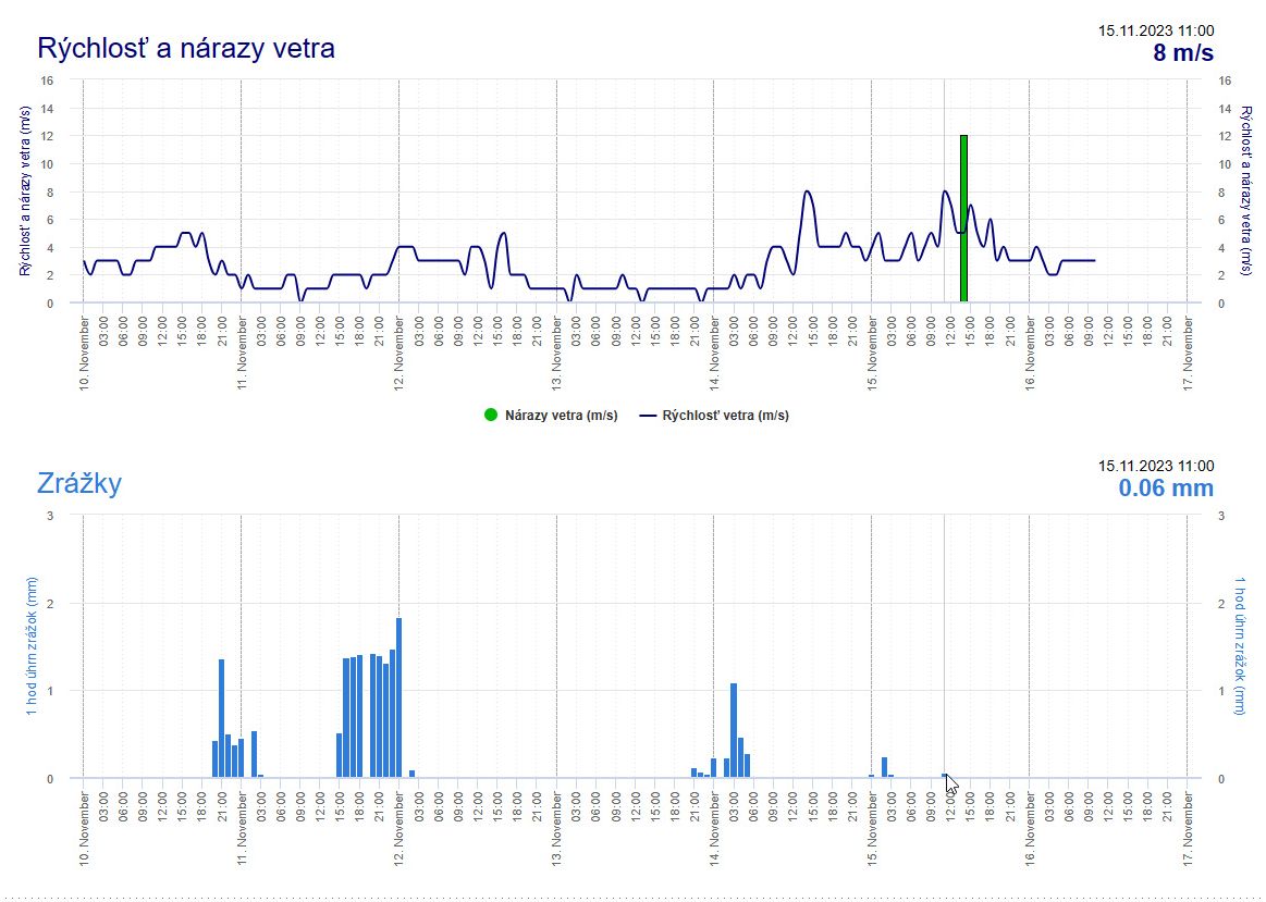 ►Results of wind speed and precipitation measurements for the location of the automatic meteorological station in the village of Boľkovce near Lučenec,spanning from November 13 to November 21, 2023, demonstrate that precisely in five out of the eight monitored intervals, monitoring activity was accompanied by rain showers with varying precipitation amounts.  (source : shmu.sk)