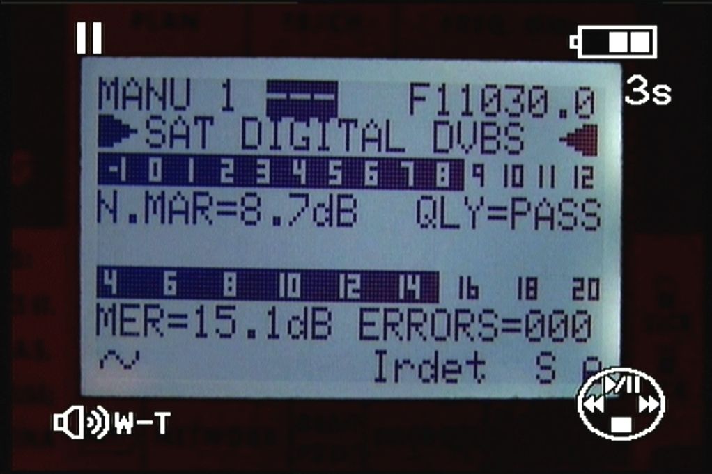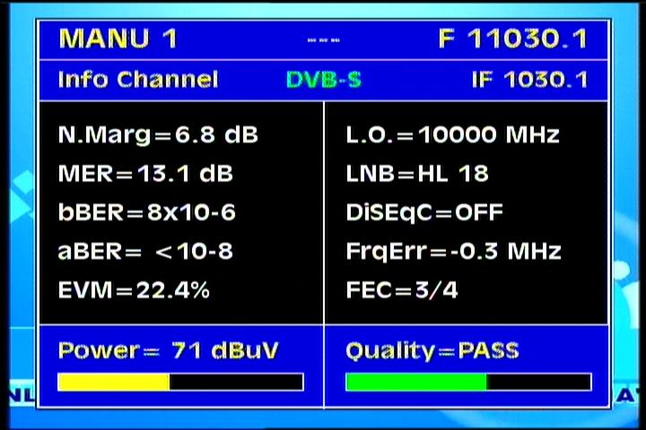 > MER=15.1 dB _ N.MAR=+8.7 dB _ Ch BER/bBER=<10-6 _ instantaneous gain margin=10+ dB <