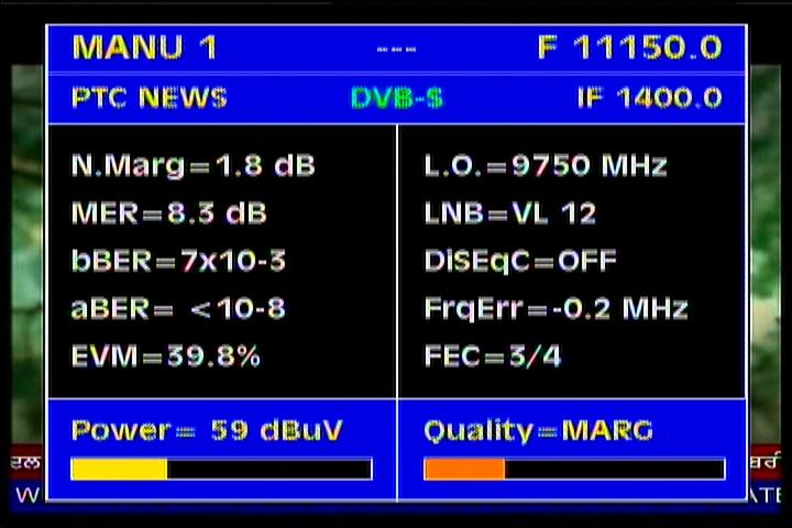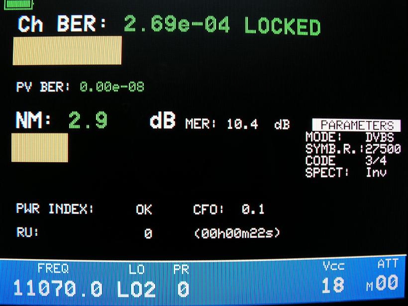 of reception follows.Average reception quality, expressed in the unit MER=9.5-11.5 dB (with occasional peak at MER=15+ dB)