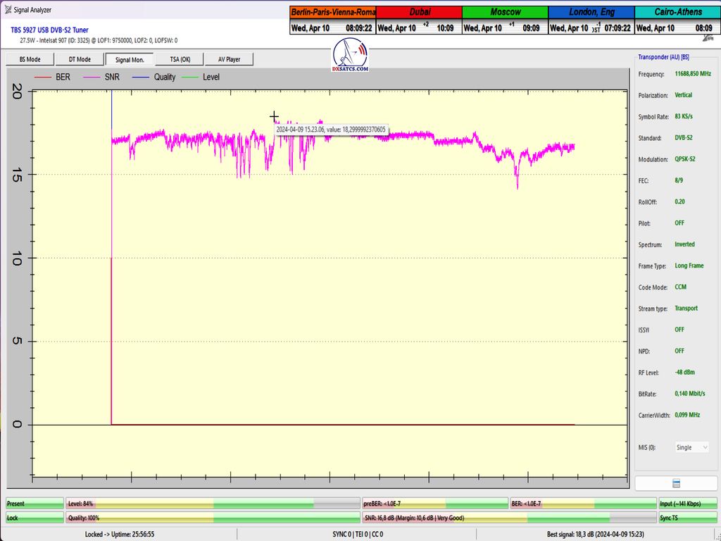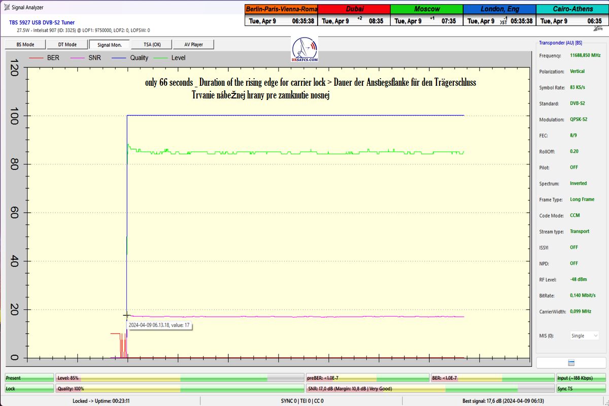 ►Auf Deutsch_Klassifikation der erreichten Ergebnisse bei f=11 689,042 MHz: Das Signalmonitoring in der Einheit t=77 Stunden beweist zweifelsfrei,dass ich ein konstantes LOCK-Verhalten mit einem Spitzen-SNR-Qualität von 17 dB erreicht habe,ohne Unterbrechung in der Kontinuität der Q-Qualität,mit anderen Worten,einen nachweisbaren Empfangsstabilität des Radiosenders SPIN 1038 mit SR=83 ksym/s zu 100%.