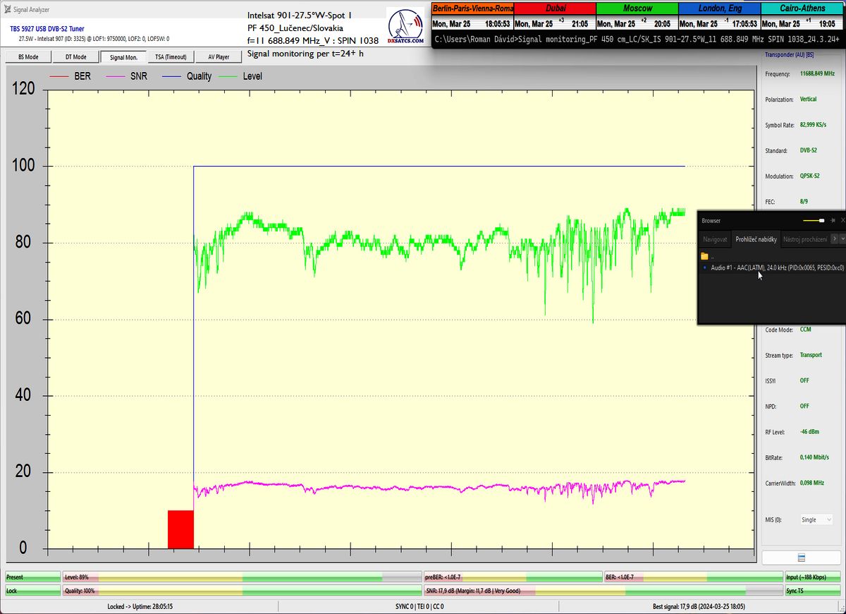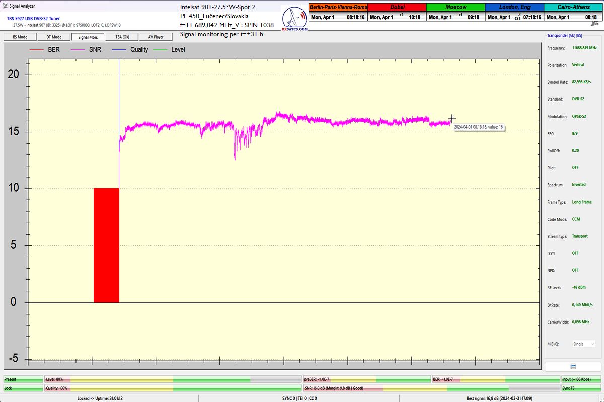 ► Prvý skúšobný monitoring a vizualizované dokazovanie s nasledovným výsledkom : stabilný príjem na 100% v jednotke t=24+ hodín so špičkou kvality SNR=18 dB, ktorý som uskutočnil od 24 do 25.3.2024