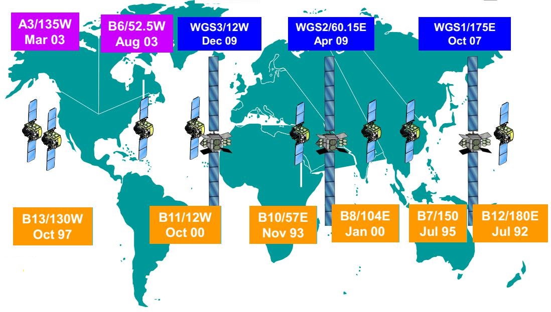 135°W+52.5°W+12W+60°E+175°E,komunikujúcich v L,X,KA ai pásmach a ktorých globálne signálne pokrytie je